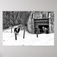 Schwarz-Weiß-Bild von Pferden und einer Scheune während eines Schneesturms im Norden Maine