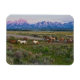 Dieses Foto bietet eine Pferdeherde, die vor dem Grand Teton Gebirge im ländlichen Wyoming während des frühen Morgenlichtes abfahren.