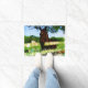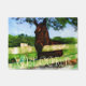 Eine Malerei eines freundlichen Pferds, das scheint, Sie über dem Zaun und dem Sprichwort "Willkommen" zu grüßen.
