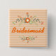 Dieser Quadratbrautknopf kennzeichnet einen Spray der Garten-Blumen des Pfirsich-, Orange und Olivgrünengrüns auf der Spitze und der Unterseite. Der Hintergrund ist ein modisches horizontales Streifenmuster, das kundengerechter Text liest: Brautjungfer. Dieses ist ein perfekter Namensumbau für Probenabendessen oder -Junggeselinnen-Abschiede.