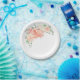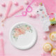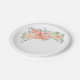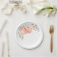 Ein hübscher, hügeliger Strauß aus Pastellpfirsich, rosa und cremefarbenen Rosen, Pfannenbäumen und Hydrangea-Blüten umkreist die Ecke der Papierplatte. Es gibt genügend Platz, um diesen Teller mit eigenem Text für ein Party, eine Dusche, eine Hochzeit oder eine andere Veranstaltung zu personalisieren.