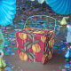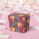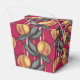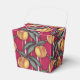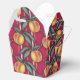 Das Originalwerk dieser "Take Out Favor Box" ist ein Muster, das von ZoeSPEAK aus einer originalen Abbildung eines Pfirsichs, der gerade aus dem Baum gepflückt wurde, gemacht wurde, wobei noch weiche grüne Blätter angebracht sind. Die goldgelbe Frucht mit orangefarbenem Blau in den Kurven ist in vertikalen Reihen entlang der vertikalen Streifen in weiß und pfirsichrosa angeordnet. Der Hintergrund des Tapeten-Musters ist Terrakottaböden rot, was ein warmes, buntes Stoffdesign mit einem Country-Gefühl macht.
