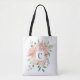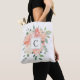 Eine hübsche Blumenstruktur aus Pfirsich, Rosa- und Weißrosen, Pfannkuchen und Hydrangea mit nachfolgender Vegetation macht diesen Totbeutel Pop mit feminininem Stil. Bearbeiten Sie das Beispielmonogramm mit Ihrem ersten oder anderen gewünschten Text.