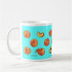 Tasse mit dem netten Pfirsich, der Entwurf zeichnet. Türkishintergrund. Diese Kaffee-Tasse mit 17 verschiedenen ursprünglichen Pfirsichzeichnungen erhellt Ihren Morgen und Nachmittag. Macht ein großes Geschenk für selbst oder andere für jede mögliche Gelegenheit.