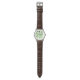 Diese Herren-Uhr hat ein modernes Design aus Pflanze, die aus Linien, Kreisen, Dreiecken, Rechtecken und Quadraten in schwarz auf grünem Hintergrund bestehen.