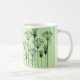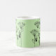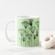 Diese Tasse hat ein modernes Design von Pflanze, die aus Linien, Kreisen, Dreiecken, Rechtecken und Quadraten in schwarz auf grünem Hintergrund bestehen.