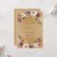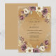 Dieses Design zeigt einen warmen Ockerhintergrund, der mit einer üppigen Anordnung aus tiefen Pflaumenrosen und cremig weißen Anemonen geschmückt ist. Zarte Kiefernzapfen und Trauben dunkler Winterbeeren sind zwischen immergrünen Zweigen und braunem Laub verteilt, um ein gemütliches Gefühl zu erzeugen. Perfekt für eine herbstliche oder winterliche Veranstaltung, ruft die Farbpalette ein Gefühl natürlicher Eleganz und rustikalen Charmes hervor.
