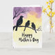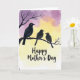 Dieses Design zeigt drei dunkel gefiederte Vogelsilhouetten, die eng beieinander auf einem schlanken, verknoteten Ast ruhen, wobei der größte links außen sitzt und zwei kleinere Vögel daneben gekuschelt sind, als würden sie sich wie enge Freunde einander zuneigen ❤️. Ihre runden, leuchtend gelben Augen verleihen ihnen einen sanften, wachsamen Ausdruck, der die dunklen Formen mildert. Hinter ihnen verändert sich der Himmel in einem glatten, gemalten Farbverlauf von tiefem Violett oben zu warmem Orange in der Mitte und verblasst dann zu einem blassen Gelb nahe dem unteren Ende wie das Licht eines frühen Morgens. Dünne, kahle Zweige ragen von dem Ast ab und zeichnen zarte Linien vor dem leuchtenden Hintergrund, wodurch eine stille, intime Ruhe entsteht. Unter der Illustration befindet sich eine fließende Botschaftenzeile, die mittig nahe dem unteren Ende platziert ist und in dunkler Schrift geschrieben ist, die sich vor dem helleren Himmel abhebt. Der Abstand lässt viel offene Fläche zwischen den Vögeln und den Worten, wodurch die Szene eine ruh