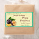 Reife Pflaumen, ganz, Teile mit Blätter werden in der links unteren Ecke dieses Etiketts mit einem hellgelben Hintergrund eingebettet, umgeben von einem Rand und einem Hintergrund von türkisfarbenem Grün, was dieses Etikett zu einem perfekten Etikett für hausgemachte Pflaume oder Konfitüren macht. Der Text befindet sich im Vorlagenformular, sodass Sie ihn auf das ändern können, was Sie möchten.