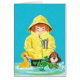 Künstler: Mädchen des Jack-Weber-| mit Regenmantel steht in den Pfützen mit Frosch, Hund und Ente
