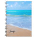 Ein personalisiertes Wendelheft mit einem Foto einer klaren, blauen Ozeanszene mit sanften Wellen an einer Küste und weichem braunem Sand. Ein blauer Himmel mit flauschigen Wolken in der Ferne. Serene tropische idyllische Jahreszeit.