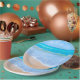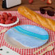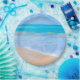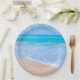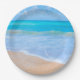 Papier Teller mit einem Foto einer klaren, blauen Ozeanszene mit sanften Wellen an einer Küste und weich braunem Sand. Ein blauer Himmel mit flauschigen Wolken in der Ferne. Serene tropische idyllische Jahreszeit.