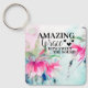 Christlicher Schlüsselanhänger zeigt eine wunderschöne, blumengeschmückte Aquarellfarbe mit rosa Blume auf blauem Hintergrund. Es zeigt die geliebte Christliche Hymn Phantastisch Grace. Der Rücken hat den ersten Vers, "Phantastisch Grace, wie süß der Klang, der ein Elend wie ich rettete! Ich war einmal verloren, aber jetzt bin ich gefunden, war blind, aber jetzt sehe ich."