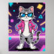 Eine stilvolle Cartoon-Katze trifft eine selbstbewusste Pose in einer neonbeleuchteten, Retro-Arkade-Welt. Diese Feline rosa Bomberjacke und coole blaue Farbtöne verkörpert die Nostalgie des 80ers und den futuristischen Flair. Mit Pixelformen und Neonbalken, die im Hintergrund leuchten, strahlt die Katze volles Selbstbewusstsein und spielerisches Swagger aus.