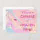 Ein modernes abstraktes Design mit den ermutigenden Worten, Sie sind in der Lage, Phantastische Dinge. Eine vereinfachende Linie weibliche Gesicht, Mund und Hand, die den Hutrand hält, mit einer hübschen Kunstkulisse in einer Mischung aus Rosa, Gelb und Touch von aquamarin. Sie können die Wörter personalisieren, wenn Sie es wünschen.