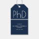 Geschenke Tags für eine PhD Graduierungsparty mit einem blau-weißen Design. Dieser Artikel ist Teil einer Sammlung von Graduiertengruppen, die eine Einladung, Foto-Ankündigung, Papierservietten, Platzkarten und mehr beinhaltet. Passen Sie diese Gegenstände an, fügen Sie sie Ihrem Warenkorb hinzu und feiern Sie diese große Errungenschaft.