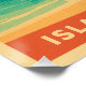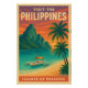 Das Retro-Reiseplakat der Philippinen zeigt seine tropische Schönheit. Im Vordergrund: weißer Sandstrand mit kristallklarem, türkisfarbenem Wasser, eine traditionelle Banca (outriga boat), die am Ufer verankert ist, und üppige, grüne Palmen, die in der Brise schweben. Hintergrund: die Kalksteinklippen von Palawan, die sich über dem Ozean erheben und ein strahlender Sonnenuntergang mit Orange, Rosa und lila Farbtönen.