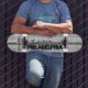 Hier ist die wunderschöne Philadelphia-Skyline, die von der anderen Seite des Delaware-Flusses in der Stadt Camden zu sehen ist. Wolken hängen über dem stürmischen Himmel, und die Spiegelungen der Wolkenkratzer sind im Wasser zu sehen.