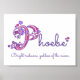 Hübsches Poster mit monogramm-Schriftzeichen, perfekt für ein Mädchenschlafzimmer oder ein Spielzimmer in Rosa- und lila-Tönen. Personalisieren Sie mit Ihrem eigenen Namen, beginnend mit P, und nennen Sie den Namen für eine wirklich personalisierte Touch für das Schlafzimmer oder Kinderzimmer Ihres Mädchens. Dieses Poster liest den Namen Phoebe Bright Strahlung, Göttin des Mondes. Niedlicher Plakatdruck ideal für ein neues Baby-, Taufen- oder Babyduschgeschenk. © Einzigartiger Brief P Mongram Herz und Blume zeichnend und Grafikdesign von Sarah Trett. www.sarahtrett.com für www.mylittleeden.com