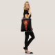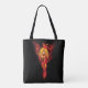 Eine Frau, die eine Flamme mit Flügeln ist. Eine Phoenixfrau in rot, gelb und orange Flammen in einem Hintergrund von schwarz.