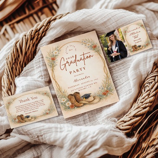 Celebrate your graduate with a warm western-inspired design featuring classic cowgirl boots, delicate wildflowers, and soft prairie grasses framing the layout. The earthy neutral palette of beige, sage, dusty blue, and warm terracotta creates a refined ranch aesthetic that feels both modern and timeless. Perfect for country-loving grads, rodeo girls, or anyone who dreams bigger under open skies. A beautiful blend of rustic charm and elegant botanical detail for a memorable graduation celebration.