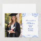 An elegant graduation celebration design featuring a delicate blue toile floral border inspired by classic European porcelain and vintage botanical prints. The intricate florals frame a clean arched center panel, creating a refined and timeless composition that highlights the graduate’s name and event details beautifully. Soft blue tones against a crisp ivory background give the design a sophisticated yet celebratory feel. Perfect for a stylish graduation gathering with a classic, romantic aesthetic.