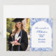 An elegant graduation celebration design featuring a delicate blue toile floral border inspired by classic European porcelain and vintage botanical prints. The intricate florals frame a clean arched center panel, creating a refined and timeless composition that highlights the graduate’s name and event details beautifully. Soft blue tones against a crisp ivory background give the design a sophisticated yet celebratory feel. Perfect for a stylish graduation gathering with a classic, romantic aesthetic.