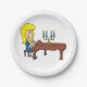 Eine Frau mit gelbem Haar, die Klavier spielt. Dieses Design wirkt auf diese Paper-Teller sehr effektiv