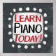 "Learn Piano Today" ist ein niedliches Textdesign in Grau mit schwarzem und rotem Text. Er sitzt auf einer weißen Akzent-Form und niedliche weiße Polka-Punkte, die ihn umgeben.