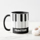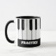 Piano-Tasten-Bild auf beiden Seiten der Tasse mit anpassbarem Text, "Praxis" gedruckt unter jedem Bild auf schwarzem Hintergrund. Ein großartiges Geschenk, Preis, Motivation oder Belohnung für Klavierstudenten oder Lehrer. Bild Copyright 2012 von Margaret E. Cmelik.