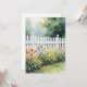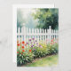 A white picket fence with flowers adorn this card. Text on the back can be changed. Image is AI-generated by IveyCottage.