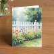 A white picket fence with flowers adorn this card. Text inside can be changed. Image is AI-generated by IveyCottage.
