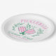 Diese Pickleball-Teller haben ein rosa und grünes Bild von Paddeln und einem Martini-Glas, umgeben von Laurel-Ästen mit dem Satz "Pickleball Cocktail Club, Bitte verantwortungsvoll trinken". Die verwendeten Farben sind grün und rosa.
