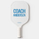 Pickleball Paddle mit Court Line Diagramm auf der einen Seite, und großer Coach-Name in Blau und Weiß auf der Rückseite ist perfekt für den Unterricht Studenten und Strategie und ist eine großartige Möglichkeit, um den Trainer zu finden auf einem belebten Hof. Alle Farben sind editierbar, inklusive der Farbfarben und Linien, Sie können den Schriftart auf dem Namen ändern und sogar ein Logo mit dem Design Editor Tool hinzufügen.