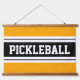 Dieses sportliche Design zeichnet sich durch klassisch starke, fette Großbuchstaben in einem hervorgehobenen, breiten schwarzen Streifen aus, der an einen hellgelben Hintergrund angrenzt, der durch den im mittleren Streifen markierten "PICKLEBALL" gekennzeichnet ist. Die Farben und Texte in diesem Design können personalisiert sein.