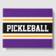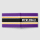 Dieses sportliche Design zeichnet sich durch einen sportlichen PICKLEBALL-Text in einem breiten, schwarzen, horizontalen Rennstreifen im Zentrum aus, der mit leuchtend goldgelben und weißen Streifen gegen königlich lila Außenrandstreifen verbunden ist. Die Farben und Texte in diesem Design können personalisiert sein.