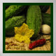 Es ist Sommer und die Gurken hängen von ihren Rebstöcken. Zeit, Dill-Pickles zu machen! Dieses Poster der Kunstfotografie zeigt alle wichtigen Zutaten: Gurken, Knoblauch, warme Chili-Paprikaschoten, Dill und picklende Gewürze. Zur Dekoration wurde eine Blume aus gelbem Gurken hinzugefügt.