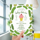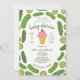 Eine Babydusche-Einladung zur Grenzdarstellung von Gurken und geschnittenen Hechtschnitten. Illustration eines Kegels aus Erdbeereis mit Kirsche und Sprinklen in der Mitte. Personalisieren Sie den Text.
