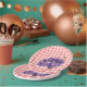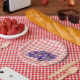 Papierplatte mit Ameise, die Trauben wegträgt.