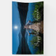 Geburtstagsbanner mit schönem Foto eines Holzsteaks, der sich über einen ruhigen See erstreckt. Nachthimmel bedeckt mit Sternen und einem schönen Vollmond.