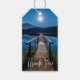 Geschenketiketten mit einem schönen Foto eines Holzsteaks, der sich über einen ruhigen See erstreckt. Nachthimmel bedeckt mit Sternen und einem schönen Vollmond.