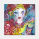 Farbenfrohe, lebendige und skurrile Aquarellmalerei in leuchtend roten, gelben, blauen, weißen, lila Farben, inspiriert vom Karneval von Venedig und der Commedia dell'Arte.