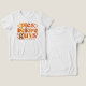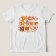 Dieses lustige und freche fallthematische Design zeichnet sich durch den spielerischen Satz "Pies Before Typ" in einem kühlen, Retro-inspiriert Schriftart aus. Der Text ist in einem kompakten, gestapelten Layout mit jedem Wort in einem anderen Schriftart-Stil angeordnet, wodurch eine dynamische und auffällige Komposition entsteht. Die Farbpalette umfasst warme Herbsttöne wie tiefe Orangen, reiche Braun und goldene Gelbtöne, die die gemütliche Atmosphäre der Saison perfekt prägen.