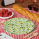Ein frisches, vom Mittelmeer inspiriertes Picknickmuster mit lebendigen Zitrusfrüchten und Sommermotiven. Dieses fröhliche Design fängt das helle, sonnige Gefühl von Picknicks an der Küste und dem mediterranen Lebensstil ein.
