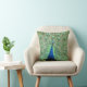 Peacock zeigt seine grünen und blauen Schwanz Federn. Die Rückseite des Kissens ist in königsblau, um die Farbe der Körperfedern zu entsprechen.