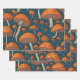 A. Muster aus orangefarbenen und weißen Pilzen vor blaugrauem Hintergrund auf Papierblättern.
