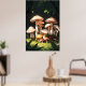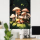 In einem üppigen Wald sind verschiedene Pilze abgebildet, von denen einige mit weißen Kappen und andere mit roten, orangefarbenen oder braunen Kappen versehen sind. Die Pilze sind in einem Halbkreis angeordnet, deren Stiele aus einem grünen Moosbett und Blätter hervorgehen. Der Hintergrund ist ein dunkler, schattiger Wald mit Sonnenlicht, das durch die Blätter strömt und die Pilze beleuchtet.