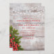 Set die Bühne für ein festliches Fest mit dieser rustikalen Weihnachtsfeier Party Einladung. Mit einem klassischen Holzhintergrund mit Saitenlichtern, Kiefernästen und lebendigen roten Beeren, vereint dieses Design die Wärme und Freude der Ferienzeit. Die elegante Typografie in Rot fügt eine traditionelle Touch hinzu, die sich ideal für eine intime familiäre Ansammlung oder für einen größeren Feiertag eignet. Personalisieren Sie die Details für eine einmalige Einladung, die Ihr Weihnachtsfest zum Leben erweckt.