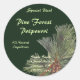 Rundes Design mit einem Kiefernhain und pineconfarbenem Set rechts unten mit dunkelgrüner Hintergrundfarbe. Die Textbereiche haben vier anpassbare Gruppen. Dieses Beispiel zeigt ein Potpourri-Label, funktioniert gut für Pine Scented Kerzen und Seifen.