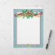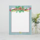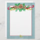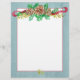 Ein Schreibpapier zum Schreiben von Urlaubsbriefen, die mit Kieferntönen, immergrünen Ästen, Beeren und einem bordeauxfarbenen Band mit grauem Rahmen und Aquarellfarben verziert sind.